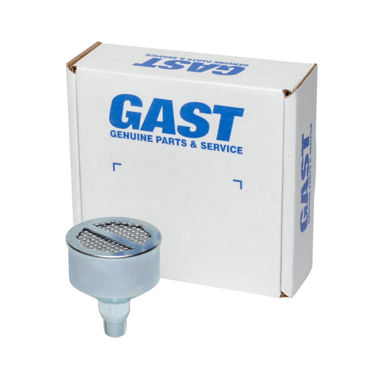 Gast AC995 replacement muffler assembly. Reduces the exhaust noise by 5-7 dBa. 3/8" NPT, 3" L x 2.7" W.