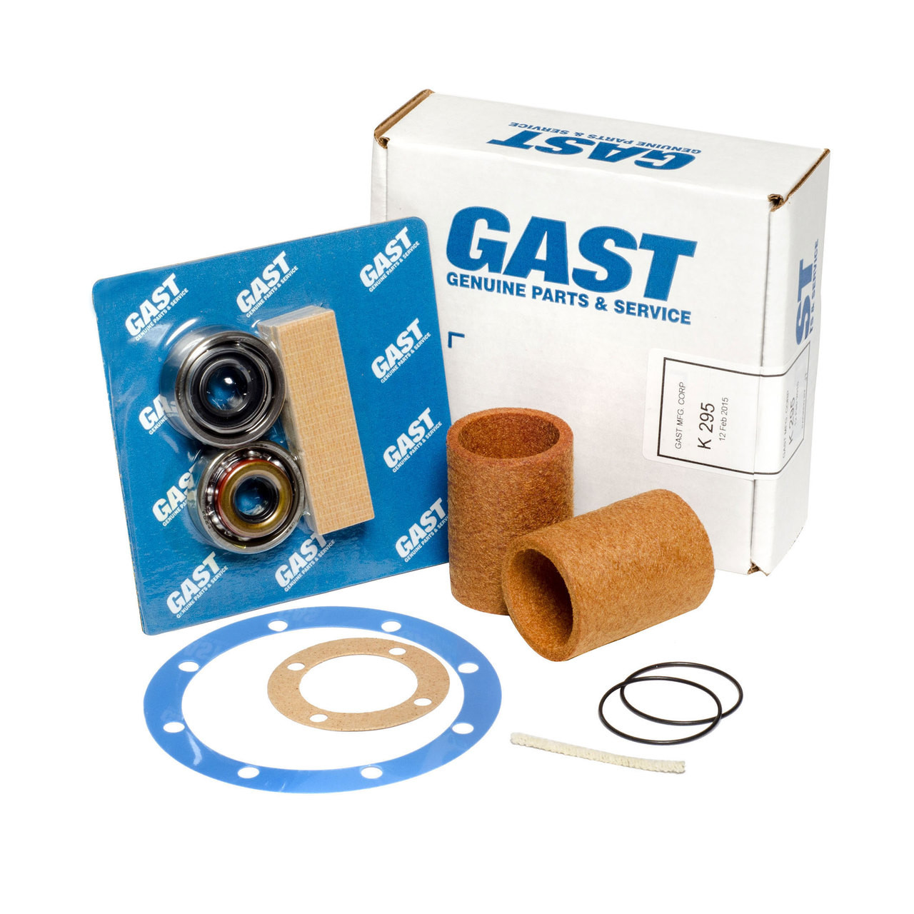 Gast K295 service kit for lubricated 2065 series units (i.e. 2065-V2A). Service kit returns your unit to original factory performance specifications. Recommend for service every 2 years. Service kit includes: Vanes, Bearings, Filters, Gaskets, Seals.