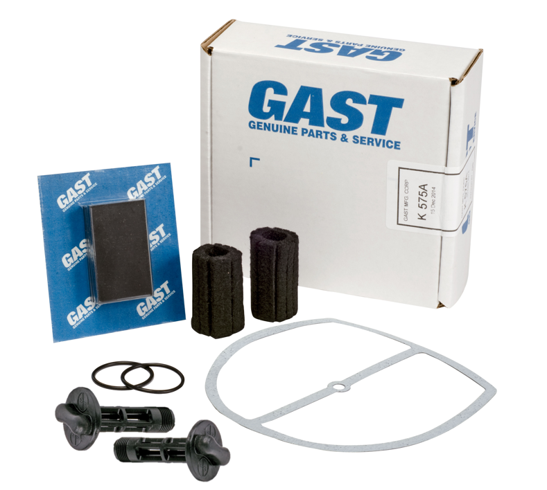 Gast K575A service/rebuild/repair kit used on oil-less 1423 models. Service kit returns your unit to original factory performance specifications. Recommend for service every 2 years. Service kit includes: Vanes, Filters, O-Rings, Endcaps, & Gasket. Important: Use Gast AH225D flushing solvent to flush debris from pump when servicing unit.